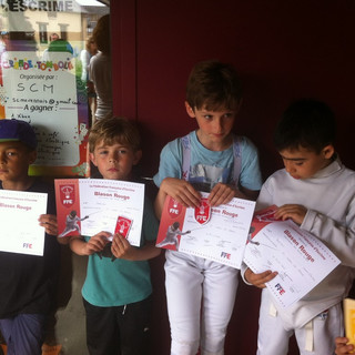 Pour clotûrer cette belle fête, autour d'un goûter, Maître Guyomard, le maitre d'armes du club, a remis à ses élèves les blasons qui valident les différents niveaux de la pratique de l'escrime. Les enfants ont ainsi reçu des blasons jaunes, rouges, bleus et verts, un arc-en-ciel de diplômes pour conclure une belle année sportive !